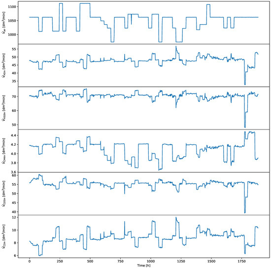 Inflow data from SOFC stack experiment in [12]. From top to bottom: Air, H2, H2O, CH4, CO2, C2 flows.