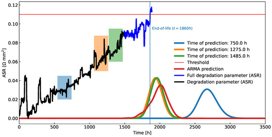 Comparison of ARMA and the derived prognostic algorithm on the experimental data. The x-axis represents the percentage of the full set of data used, simulating the real-life scenario of data accumulating over time. The horizontal red line denotes EOL for the stack. While both models converge to a similar solution, which is in line with the actual ASR’s breach of threshold when at least of data are available, they both experience major deviations from the correct result when the data are insufficient. The major difference between the methods is that the new prognostic algorithm undergoes variance explosion when data are scarce, while ARMA stays overconfident.