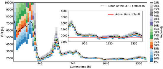 Similarly to Figure 16, Figure 17 shows quantiles of FHT distributions derived throughout the experiment. Abrupt changes in the mean of the FHT distributions can be observed, which indicate volatile oscillations of ASR during the measurement process. In the magnified inset of the figure we again compare the actual FHT to the prediction. Upon closer examination, we conclude that the predicted FHT distributions successfully encompass the eventual EOL as early as h.
