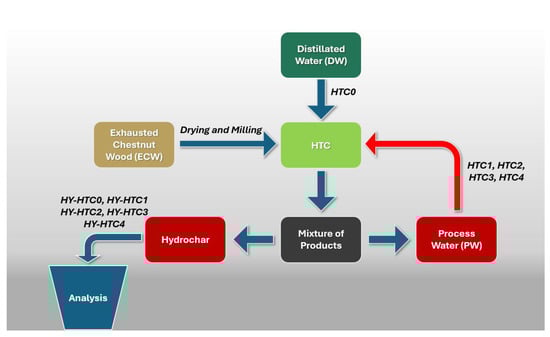 Prior investigations conducted by [15,16,17,18] have yielded promising results, showcasing the potential benefits of process water recycling in terms of enhancing hydrochar yield, improving energy recovery, optimizing combustion performance, and mitigating environmental impacts. Upon review of the existing literature, it became evident that there is a lack of studies investigating process water recycling specifically within the HTC process applied to spent chestnut wood biomass.