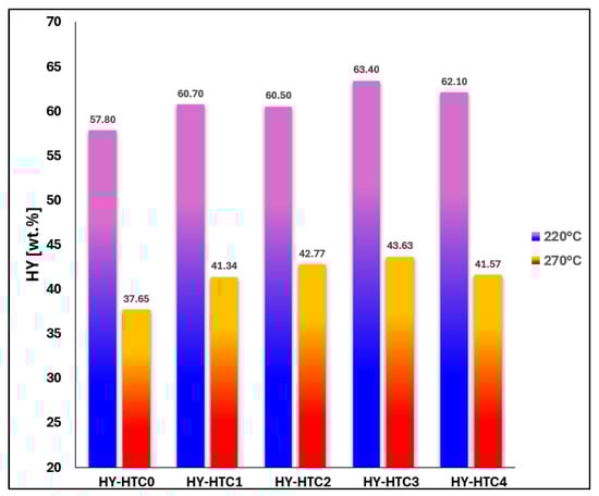 Figure 2 illustrates how recycling PW affected the mass yield of the hydrochars produced via the HTC tests conducted at varying temperatures (220 °C and 270 °C). Initially, it was noted that the mass yields of the hydrochars decreased with increasing temperatures from 220 °C to 270 °C. This was mainly due to the higher HTC temperature that promoted greater biomass degradation in terms of cellulose, hemicellulose, and lignin [15,26,27].