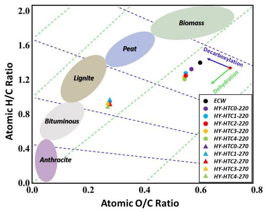 The atomic O/C and H/C ratios were also analyzed and displayed in a Van Krevelen diagram (Figure 3). This diagram offers valuable information about the qualities and types of different fuels and biomasses. A lower O/C–H/C atomic ratio indicates favorable characteristics such as reduced smoke, water vapor, and energy losses during combustion [49]. Additionally, the calorific value of biomass decreases with increasing O/C and H/C ratios. For HTC0, the H/C and O/C ratios decreased significantly at a temperature of 270 °C, mainly due to dehydration and decarboxylation. Throughout PW recirculation, there was no notable decrease in the H/C and O/C ratios, suggesting that the organic compounds in the PW were more favorable for the decarboxylation reaction. Wang et al. [29] similarly noted a significant decrease in the O/C ratio with increasing PW recovery, while the H/C ratio remained relatively stable.