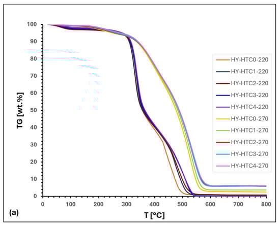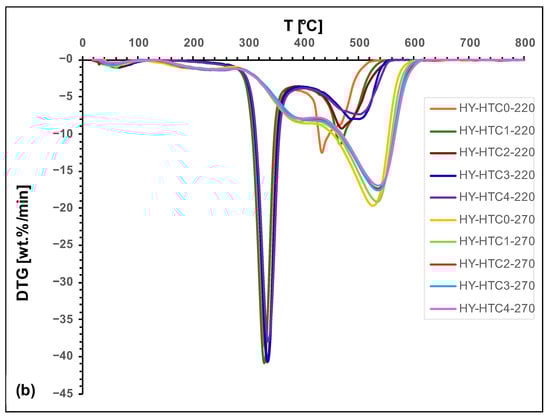 By increasing the HTC temperature, a slight increase in Ti was observed, while Tp and Tb exhibited a much more pronounced increase. For HY-HTC0, the temperature at the start of combustion varied by about 4 °C, while the peak and burnout temperatures varied by about 197 °C and 73 °C, respectively. With PW recirculations, the Ti and Tp temperatures at 220 °C showed a small variation, with a maximum of about 5 °C and 7 °C, respectively, while the burnout temperature showed a much more pronounced change (from 508.6 °C to 548.1 °C). Similarly, at a temperature of 270 °C, Ti and Tp showed a slight variation with increasing recirculation, while Tb showed a marked increase. This was also reflected in the increasing trend assumed by the fuel ratio. Therefore, the process temperature and PW recirculation increased the combustion range, whereas the temperature had a greater influence. As the HTC temperature increased, the DTGmax for the hydrochars exhibited a decreasing trend, while there was a slight increase in the corresponding peak temperature (Tp). This was related to the reduction in volatiles and the concurrent increase in fixed carbon contents [54].