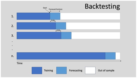 In order to evaluate the models, backtesting with expanding window optimization was utilized, as shown in Figure 2. Given that the training is based on a historical dataset, the amount of data will increase over time. Backtesting allows for a more precise assessment of the model’s efficiency after incorporating new data [].