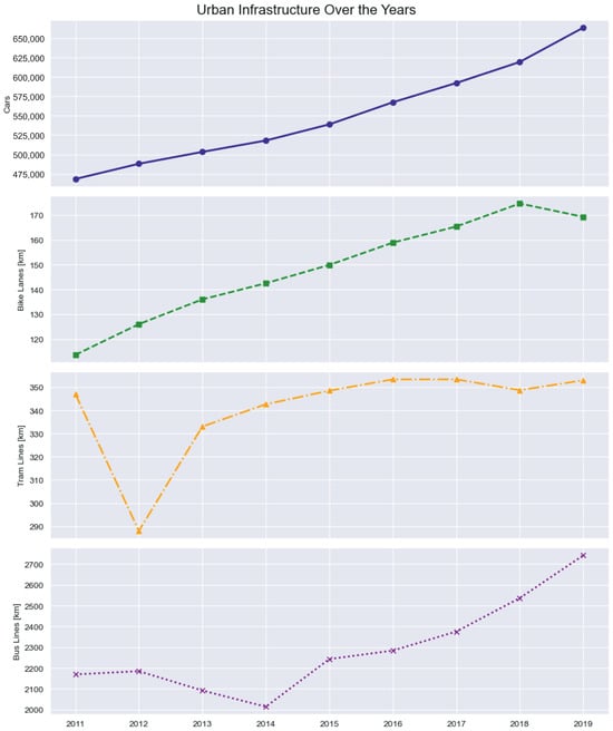 Krakow’s urban infrastructure over the years 2010–2019—number of registered cars (blue), bike lines in kilometers (green), tram lines in kilometers (orange), and bus lines in kilometers (purple).