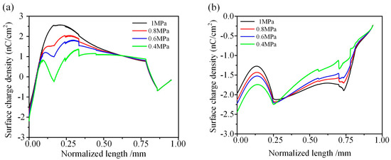 Gas pressure plays a crucial role in determining the conduction current on the gas side. With the increase in gas pressure, the ion pair generation rate increases, the recombination coefficient increases, and the mobility of ions decreases [7,8,9]. The impact of gas pressure on surface charge density is depicted in Figure 3.
