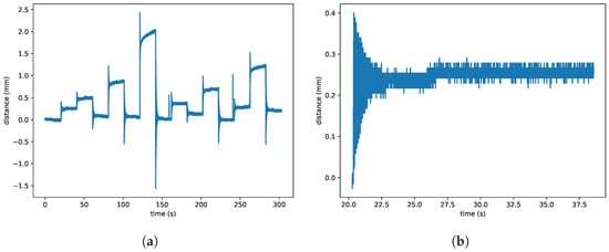 To develop an algorithm to predict membrane damage before it occurs, a dataset consisting of 54 series of distance measurements (49 with non-damaged actuators and 5 with damaged ones) was created. For non-damaged actuators, each series consisted of 300 s of distance values measured 1000 times per second, thus constituting 300,000 samples. For damaged actuators, the series was truncated according to expert knowledge (in all cases, this was the point at which the signal was out of range and remained constant).