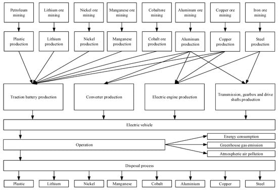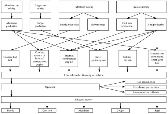 The life cycle diagram is compiled at the LCA’s first stage. This scheme takes into account the processes of mining, production of details and assemblies, as well as disposal. The EV life cycle diagram is presented in Figure 1. The ICEV life cycle diagram is presented in Figure 2.