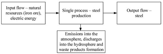 The inventory analysis of the system is carried out in the third stage. This is the collection of qualitative and quantitative information about the input and output material and energy flows for each single process. This stage is the most time-consuming, based on the huge amount of information used. An example of a single process for steel production is shown in Figure 3.