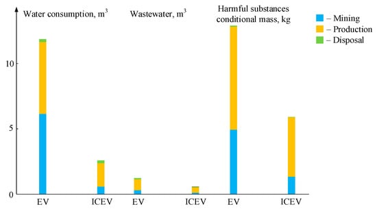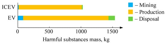 - Reduced masses of harmful substances in waste products, wastewater, and atmospheric air are significantly higher for EV production due to the use of technological processes with more toxic emissions;
