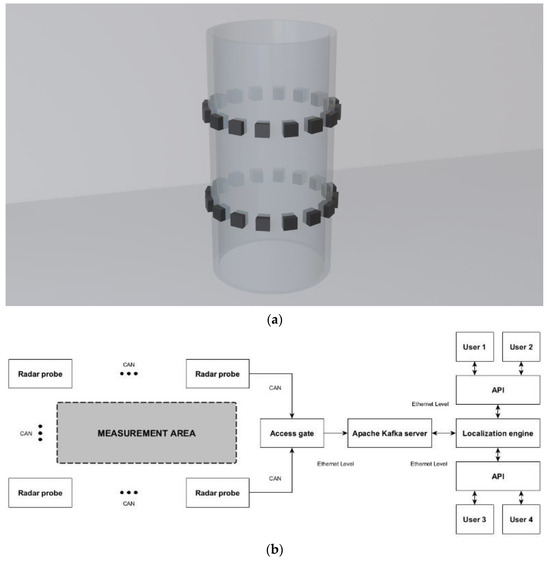 (a) Symbolic visualization of the radio probe placement idea for reflection tomography, assuming a cylindrical test area and analysis in more than two dimensions. (b) Block diagram of the built radar detection and intra-building localization system.