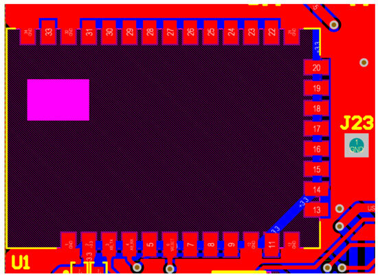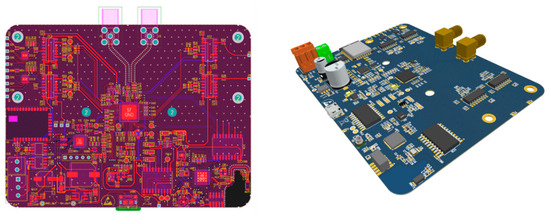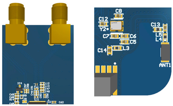 Maximum dispersion is made on the assumed PCB area to avoid mutual interference generated by the RF modules. The areas directly adjacent to the areas of transmission lines and antennas are utterly devoid of copper. The exception is the routing of the transmit and receive paths of the RF front-end system. Because of the nature of the solution, these lines are surrounded by a shield from start to finish. On the PCB, this screen is the ground polygon, while at the transition to the cable, it is the braid. The locations of the most radio-active zones are collected and presented in Figure 4 and Figure 5.