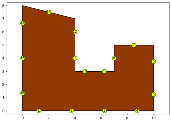 The mesh (set of finite elements) was defined for the viewing area. For each finite element, we created a learning data set. Let be the data set containing n samples. For the i-th sample, 1 ≤ i ≤ n, the vector denotes the realizations of input variables, in this case, pre-processed signals obtained from sensors. The sensors were installed on the envelope of the viewing area. The value yi = 1 means that the finite element is included (success) in the viewing area, whereas yi = 0 denotes that the finite element belongs to the background (unsuccess). Sensors were installed in the room, as shown in Figure 6. A mesh was created for the room as follows: