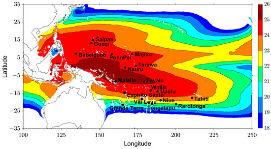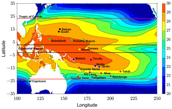Figure 1 shows the areas where the temperature difference between the sea surface and 1000 m depth is higher than 18 °C. The warm pool in the Western Equatorial Pacific is particularly relevant for OTEC, with temperature differences ranging from 24 to 26 °C. However, several islands are in transition zones. Particularly, the Southern Islands are close to the sub-tropics, and therefore, the seasonal change is relatively large. For these reasons, the ocean thermal energy potential of each island may vary. Moreover, the Tropical Pacific Ocean is affected by El-Nino/Southern Oscillation (ENSO), and the inter-annual variability of the SST of the PICTs has not yet been analyzed on a local scale.