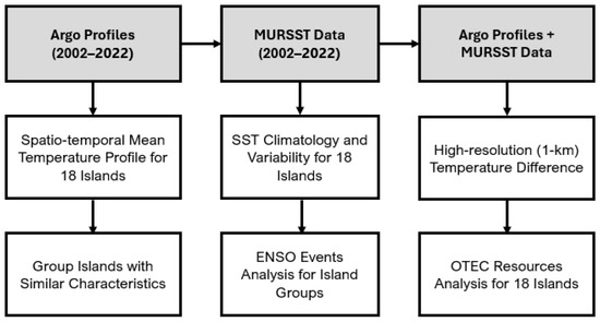 Figure 2 summarizes how these datasets are utilized in this study. Spatio-temporal mean temperature profiles were obtained for the 18 islands, and based on their characteristics, the islands were grouped into five categories. The SST climatology from the MURSST dataset was used to assess the climate variations of the 18 islands, with a particular focus on the impact of ENSO events. Finally, the two datasets were combined to assess the OTEC resources of the 18 islands, with the mean Argo Profiles providing DSW temperature and the MURSST providing a 1 km gridded SST.