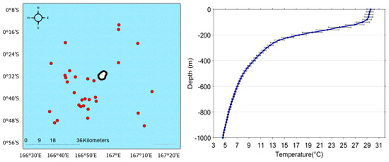 Argo profiling data were averaged for all the cycles in the analysis domain (Table 1) from 2002 to 2022. The depth range was from 0 m to 2000 m every 20 m. Figure 3 left shows an example of the spatial distribution of the 30 Argo cycles for the island of Nauru, in which the Southwest quadrant has the largest number of profiles. The number of floats and number of Argo profiling cycles vary among islands and are summarized in Table A1 (Appendix A). The temperature data were averaged, where is the mean temperature and is the standard deviation, and is the total number of cycles.