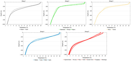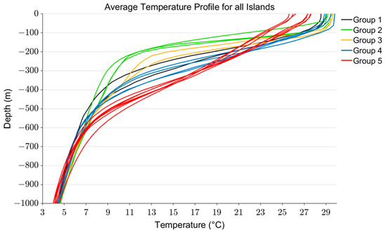 Average temperature profiles for all 18 islands based on Argo measurements from 2002 to 2022 in the analysis domain (Table 1). Black represents Group 1, green represents Group 2, yellow represents Group 3, blue represents Group 4, and red represents Group 5.