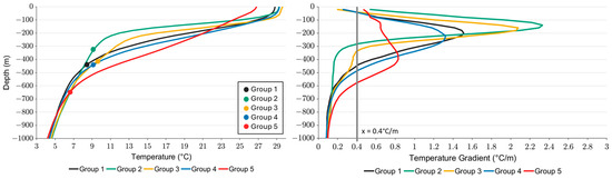 Average temperature profiles for each group, showing the depth where temperature difference reaches 20 °C (left) and average temperature gradient for each group (right) based on Argo measurements from 2002 to 2022 and domain coordinates from Table 1.