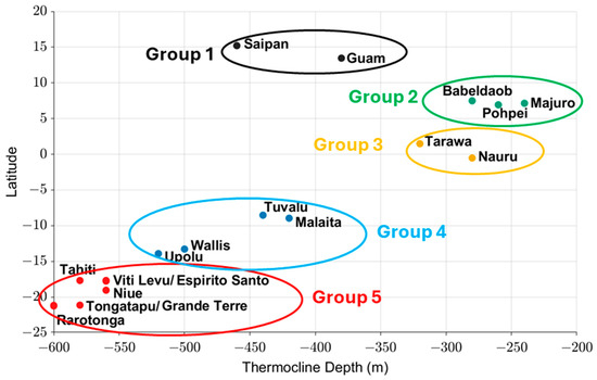 - [Group 5] Grande Terre, Espirito Santo, Tahiti, Viti Levu, Niue, Rarotonga, and Tongatapu are the southernmost islands and are located in the SEC. They are characterized by a shallow mixed layer depth and a gradual decrease in temperature from the surface until approximately 600 m. The 400 m depth temperature is the warmest among the five groups.