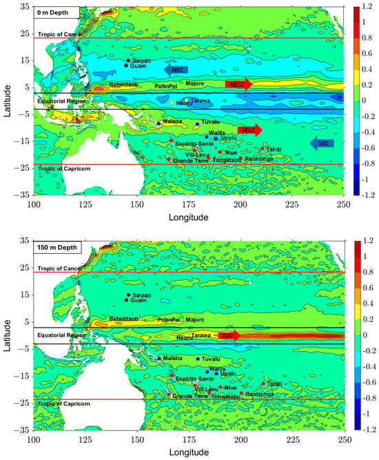 In the Tropical Pacific, from the north to the south, the dominant surface currents are the westward North Equatorial Current (NEC) and the eastward North Equatorial Counter Current (NECC) in the northern hemisphere. In the southern hemisphere, the current fields are less well-defined because of the monsoon influence. The westward South Equatorial Current (SEC) occupies a broader latitudinal range from 20° S to near the Equator, and there is an opposing current flowing eastward called the South Equatorial Counter Current (SECC) at latitudes north of 5° S (Figure 8 top). At the Equator, the Equatorial Under Current (EUC) flows eastward at a depth of 150 m (Figure 8 bottom). These dominant current fields are well represented in HYCOM GOFS 3.1. The majority of the islands are located within the western Pacific “warm pool”, where the SST is higher than 28 degrees (Figure 9). The SST of these islands is higher than that of regions near the Tropic of Cancer, where the existing OTEC plants in Kume Island and Hawaii Island are located. The SST of the island regions near the Tropic of Capricorn are much lower, ranging from around 25 to 27 degrees.