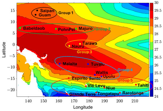 Among all the islands, islands from Group 5, located near the South Pacific, have shown the highest seasonal variability and achieved the lowest SST values from August to September. These islands are located near the Tropics of Capricorn and therefore are most affected by the extra-tropical climate. On the other hand, Groups 3 and 4, which have proximity to the Equator, have the lowest seasonal variability because they are located within the warm pool. They showed that the highest temperatures are from August to October, and the lowest temperatures are from December to March. These features are also visible in Figure 11, where SST seasonal climatology is mapped. We can see that variability for the tropical islands is large, while Equatorial Pacific islands have the least seasonal variability. Overall, the SST variability increases with latitude.