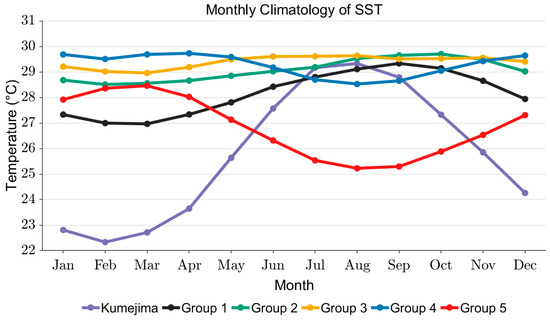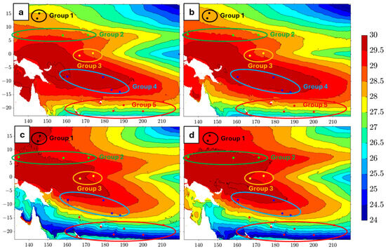 SST climatology data for the Pacific domain using MURSST data from 2002 to 2022. Black circles represent Group 1, green circles represent Group 2, yellow circles represent Group 3, blue circles represent Group 4, and red circles represent Group 5.