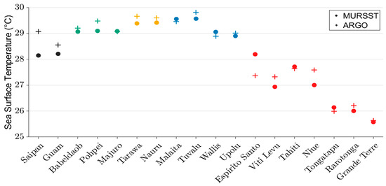 SST climatology data were compared to the climatology data obtained from Argo measurements for all 18 islands, as shown in Figure 12. The difference between SST climatology from MURSST and Argo SST remained less than 1 °C for all islands, which is approximately a 3% difference. The largest difference between MURSST and Argo SST was found to be at Saipan (0.924 °C) and Espirito Santo (0.833 °C), which are located in the Northern and Southern parts of the Equatorial Pacific, respectively. In other islands, the difference between MURSST and Argo SST was less than 1%. Therefore, assuming that Argo is providing reliable measurements, we conclude that MURSST data are suitable for further analysis.