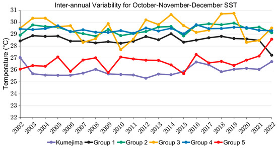 Inter-annual variability follows different patterns for each group (Figure 14). We found that Group 3 had the highest interannual variability among groups, going from its lowest peak at 27.7 °C (2010) to its highest peak at 30.7 °C (2019). This is because Group 3 contains Equatorial Pacific islands, which are prone to SST variability during El Nino and La Nina years. The Oceanic Nino Index (ONI) is plotted in Figure 15, showing the yearly averages of October, November, and December data to identify the effects of ENSO on interannual variability. Group 5 also showed a significant interannual variability from 25.7 °C in 2015 to 27.3 °C in 2016, where large ONI values were also found (Figure 13). This demonstrates that the shift from El Nino to La Nina events in a short period has affected the islands furthest away from the Equator. Interestingly, Groups 1, 2, and 4, which are closer to the Equator in comparison to Group 5, have much lower interannual variability. These comparisons demonstrate the complexity of the SST variations associated with ENSO in the Western Equatorial Pacific. For reference, the SST from the island of Kumejima is plotted in Figure 13 and Figure 14. The SST values from November to May are low compared to the PICTs, monthly variability is high, and the inter-annual variability is significant as the island is in the mid-latitude.