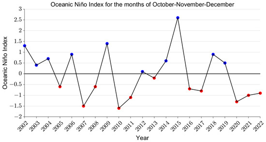 Oceanic Nino Index (ONI) for each year from 2002 to 2022 using the average for the months of October, November, and December. Data were taken from NOAA National Weather Service.
