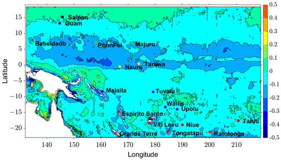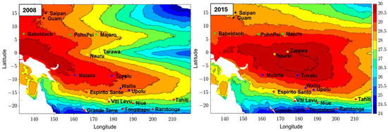 During the El Nino year (2015), the center of the Pacific Warm Pool shifted to the east, covering a large area of the Eastern domain of the Western Pacific (the domain given in Figure 16), with temperatures higher than 29 °C. However, none of the 18 islands have shown an increase in SST during this event. Instead, they all showed a negative trend. Group 1, in particular, had the lowest peak temperature during 2015, with an average of 25.7 °C. This is because, in addition to the zonal shift of the warm pool, the meridional extent of the warm pool reduces during the El Nino year. Therefore, all the SST of the 18 islands decreased during the El Nino year. It is important to note that SST increases in the Eastern domain of the Western Pacific, where few inhabited islands exist.
