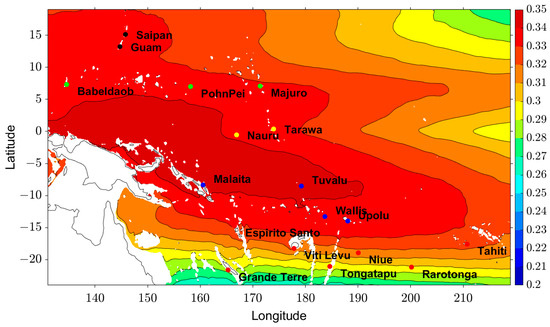 First, we estimate the power density in the Pacific domain using HYCOM SST and 700 m depth temperature climatology. Figure 17 shows the (W/m2) climatology for the Pacific domain covering all 18 islands (Table 1). A higher power density was found in the warm pool, where the SST is high. Values throughout the domain vary from 0.257 to 0.322 W/m2, leading to approximately 20% variability that reflects differences in energy production among the islands.