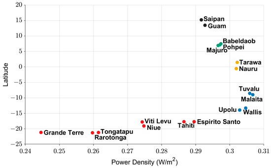 Following the Pacific domain analysis of power density, each island was also individually analyzed using SST climatology from MURSST and the 700 m depth temperature from the averaged Argo temperature profiles. Looking into singular sites on each island allowed us to compare ocean thermal resources among islands. Figure 18 shows the climatology for all 18 islands. Malaita showed the highest at 0.306 W/m2, while Grande Terre showed the lowest at 0.244 W/m2. Even though Tuvalu had the highest values for SST climatology, the DSW temperature at a 700 m depth was lower at Malaita, which led to a higher power density.