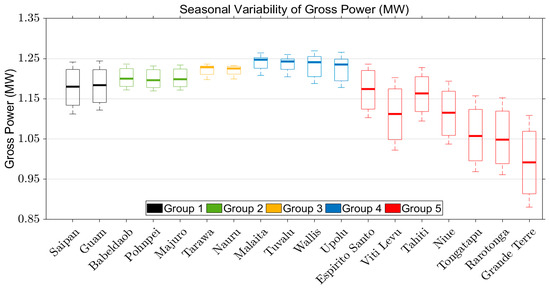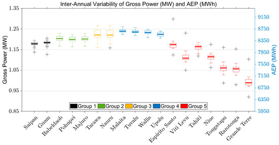 Finally, the stability of the AEP is a key factor in lowering the cost of the OTEC plant. In Section 3, we have investigated the interannual variability of SST and the seasonal cycle of SST. The interannual variability of AEP is largest in Group 5, considering the outlier values, particularly Espirito Santo and Viti Levu (Figure 19). The variation reaches almost 1 GWh, which is nearly 15% of the AEP. The variability of these two islands is associated with ENSO, reflecting the interannual variation of the meridional extent of the warm pool (see Section 3.3.1). Likewise, the variabilities of Grande Terre, Tongatapu, and Rarotonga are close to 1 GWh. The reason for this is not evident yet, but considering the complexity of the South Equatorial Current being affected by both ENSO and monsoon, a large variability is expected. Tarawa and Nauru in Group 3 are also affected by ENSO, and their AEP varies around 700 MWh, which is not negligible. Most stable are the islands in Group 4, located upstream of the eastward SECC.