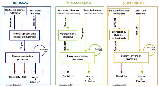 Selected system boundaries of: (a) energy production from biogas; (b) electricity production from solid biomasses; and (c) electricity production from bioliquids. The red arrows indicate the products obtained and sold to the grid.