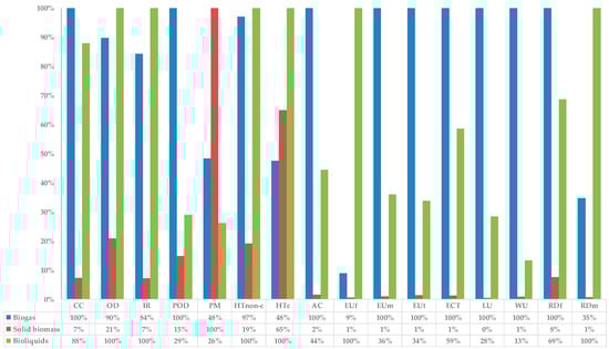 Moreover, the normalization phase highlighted relevant impacts for the WU and EUm categories, both associated with electricity production from biogas. Specifically, in WU, the impact from biogas (8.48 × 10−04) was over 7 times greater than that associated with bioliquid usage and over 100 times higher than the impact from solid biomass electricity production. This impact primarily stems from water consumption for irrigation during the cultivation of dedicated biomass.