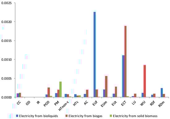 Conversely, biogas exhibits the highest environmental impact, demonstrating the least favorable environmental performance in 9 out of the 16 investigated impact categories. Life cycle analysis (LCA) highlights that dedicated energy crops contribute significantly to the environmental impacts associated with electricity production, not only for biogas but also for bioliquids. Indeed, the cultivation of these crops needs water and chemical fertilizers, leading to adverse environmental consequences. Therefore, these results point out the importance of prioritizing residual biomass for energy production over dedicated crops. This includes utilizing forestry and agro-industrial residues, municipal solid waste, and used cooking oils. Leveraging these discarded materials offers numerous benefits, including environmental preservation, resource conservation and recovery, and waste reduction.