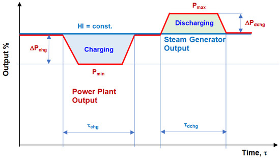 During ESS charging, the plant power output P decreases by ΔPchg, since the steam or condensate (thermal energy, heat) are diverted to the ESS, resulting in a decrease in the steam turbine power output. The gradual linear change in the plant output is presented in Figure 1. To simplify the analysis and interpretation of results, the heat input (HI) to the steam generator was assumed to be constant. When the ESS charging was completed, the plant power output increased to its previous value because the steam or condensate (heat) were no longer diverted to the storage.