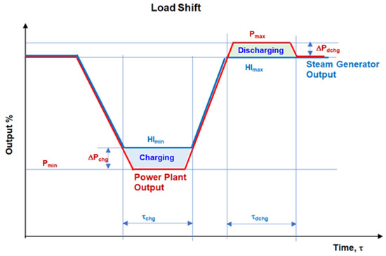 The effect of an ESS integrated with a power plant on plant flexibility and performance depends on the ESS design, integration with the power plant, storage capacity, and operation. For example, an ESS integrated with a power plant may be used to lower the minimum operating load to avoid plant shut-down and improve performance at the minimum load, extend the operating load range by shifting load between the minimum and full (peak) loads, increase the load ramp rate (load change rate), improve plant cycling performance (load following or frequency regulation), and reduce cycling damage to the plant, and improve plant dynamic performance to enable and improve plant participation in the ancillary service market. A schematic representation of some of these operating scenarios is presented in Figure 1 and Figure 2. It has to be noted that the ESS charging and discharging are transient processes, as shown in Figure 1.