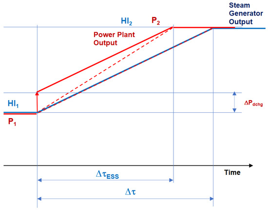 For a given ΔP, the slope of the load ramp can be increased by shortening the time Δτ. An ESS integrated with the power plant can increase the LR slope by decreasing the load change the plant has to execute and, thus shortening the time required for the load change without affecting the rate of HI to the steam generator, ΔHI/Δτ. As presented in Figure 3, discharging the integrated ESS, at the beginning of the LR increases the LR slope by shortening the time required for the load change. Alternatively, the LR slope can be increased by discharging integrated ESS at the end of the load ramp.