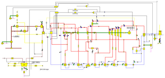 The EP model of the reference plant is shown in Figure 5 where the yellow-colored symbols represent the plant components and sub-components. The WCC and WCT are located near the right edge of Figure 5. The predictions obtained for the unit loads lower than the design condition are based on the full load (design) performance by running the EP model in the off-design (OD) mode which makes use of the models of unit components, such as steam turbine, condenser, feed water heaters (FWHs) and other heat exchangers, boiler, pumps, fans, etc. The most complex of these models is the steam turbine model which uses Stodola’s ellipse [46,47,48], to relate steam flow and pressure at the off-design conditions, and the Spencer, Cotton, and Cannon (SCC) model for the turbine stage efficiency [47].