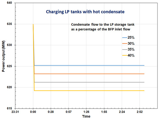 The effect of the condensate tank charging on the plant power output is presented in Figure 7, where the plant power output is plotted as a function of the charging time over a range of condensate extraction flows. The results show that the power output decreases almost instantaneously when a portion of the hot condensate flow leaving the feedwater storage tank is diverted to the LP tanks and stays constant during the charging process. During discharge, the plant power output increases almost instantaneously. These results show that the LP condensate storage system provides fast response.