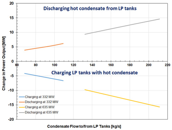 The effect of the LP condensate charging and discharging flows on the plant power output, presented in Figure 8 for the minimum and full load operation, shows that the effect of the charging/discharging flow on plant power output is linear and increases with the condensate flow. The full load charging/discharging flows presented in Figure 8 correspond to 25 to 40% of the boiler reed pump (BFP) flow, and for the analyzed Reference plant result in a power output change in the ±10 MW (±1.5% of full load) to ±15 MW (±2.3%) range. In other words, integration of the LP condensate storage system would, at full load and condensate flow corresponding to 40% of BFP flow allow the reference plant to follow load in the ±15 MW range (2.3%) and improve its participation in frequency regulation or increase the maximum power output by 15 MW when power prices are favorable. Charging the LP condensate storage system to the minimum load would reduce plant power output by 6.2 MW (1.8%).