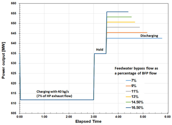 The effect of the 2-tank MSS system charging and discharging on the plant power output at full load is presented in Figure 11, where the plant power output is plotted as a function of time. As shown in Figure 11, the system is charged for 3 h using the CRHT steam at a flow rate of 40 kg/s, placed on hold for 30 min, and then discharged using a range of the FW bypass flows. The results presented in Figure 11 show that the plant power output decreases almost instantaneously when the charging steam is diverted from the HP turbine discharge and stays constant during the charging process. The power output increases almost instantaneously to the baseline level when charging stops.