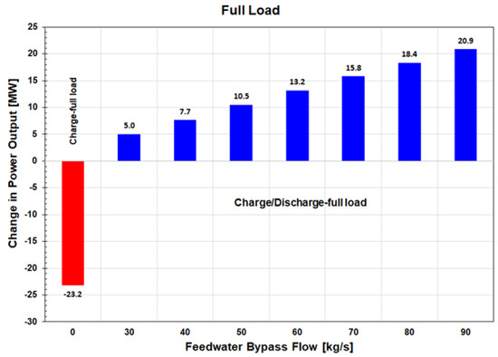 The analysis was also performed for the scenario where a 2-tank MSS system was charged at the minimum load and discharged at the full load to simulate the load shift. For the analyzed operating conditions, the power increase of the reference plant at the maximum load achievable by the load shift (Figure 2) is 11.3 MW (1.8%) for a FW bypass flow of 90 kg/s, i.e., lower compared to the power increase achieved when charging and discharging is performed at full load; the ηPP in this case is 96.7%. However, since the discharging flow is high compared to the charging flow, the discharging time is shorter compared to the charging time, which increases the value of fz and reduces the value of ηRTE. The results obtained for the 2-tank MSS storage systems are similar to the results reported by Kruger et al. [40].