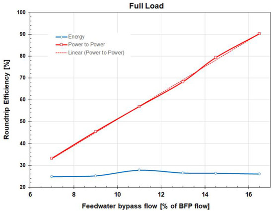 Roundtrip power-to-power and energy-to-energy efficiency vs. feedwater bypass flow.