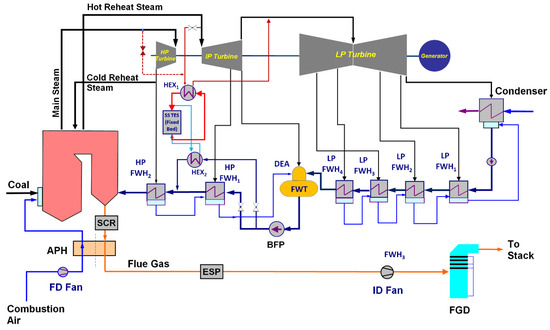 The integration of a FB TES system with the Reference plant analyzed in this work is presented in Figure 15 where the FB TES system is charged by using the hot reheat (HRHT) steam extracted from the steam turbine cycle at 538 °C. Since using the HRHT steam does not affect operation of the steam reheater, boiler and HP turbine, such integration arrangement allows for high HRHT steam extraction flows and high storage capacity of a FB TES system. However, operation and power output of the intermediate-pressure (IP) and low-pressure (LP) turbines is affected due to the reduced steam flow rate. Since the heat storage medium (crushed rock, ceramics, etc. [56]) can operate at high temperature, using high temperature charging steam results in a smaller TES system because heat is stored at a higher enthalpy.
