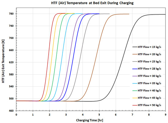 The modeling results show that the HTF flow rate has a significant effect on the FB TES system performance, both during the charging and discharging. The variation of the HTF temperature at the bed exit with the charging time and HTF flow rate is presented in Figure 16. As the results show, the charging time and the HTF flow rate have a significant effect on the HTF temperature leaving the bed. For the selected FB size and a reference HTF flow rate of 28 kg/s, the HTF temperature at the bed outlet remains constant for approximately 2.5 h. For a longer charging time, the HTF bed outlet temperature sharply increases and reaches a maximum value in approximately 4.5 h, when the bed is fully charged. During the bed discharge, the HTF temperature is initially constant but sharply decreases for longer discharging times approaching the minimum temperature when the bed is fully discharged. A lower HTF flow increases the duration of the constant temperature plateau and bed charging/discharging time, while a higher HTF flow has the opposite effect.