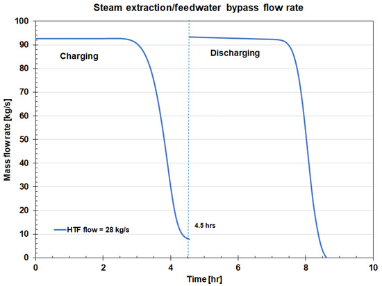 As a result of the transient performance of the FB TES, the flow rates of the charging steam and FW bypass flow are not constant during bed charging/discharging but vary with time, as presented in Figure 17. These results were obtained by integrating the FB TES model with the reference power plant model. As presented earlier, during the bed charging with a constant HFT flow, the HTF outlet temperature is initially constant but increases sharply as the thermocline effect propagates to the bed top. This increase in the HTF bed outlet temperature (HEX1 inlet temperature) results in a decrease in the charging HRHT steam flow needed to maintain constant HFT temperature at the HEX1 outlet, as shown in Figure 17.