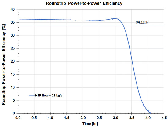 Since the locations where the condensate is taken from and returned to the steam turbine cycle are very close to each other, the exergy of the condensate flows at these locations is also similar, resulting in a high power-to-power and energy-to-energy RTE, as presented in Figure 9. Also, since changes in the power output ΔPchg and ΔPdchg during the charging and discharging of the storage tanks remain constant for the same charging and discharging times, according to Equation (3), the roundtrip energy-to-energy efficiency ηRTE is the same as the power-to-power efficiency ηPP.