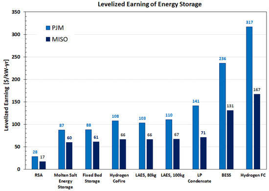 The economics of energy storage and valuation of flexibility options was studied in [62,63,64,65,66], while the economics of BESS was presented in [67]. Optimal dispatch of a coal-fired power plant was investigated in [68]. The analysis of the economic performance of the ESS systems analyzed in this study was performed by Customized Energy Solutions (CES) Ltd. for the PJM and MISO energy markets using real market prices and trading rules to determine plant economic performance under realistic market conditions. The analysis was performed using the economic dispatch model developed by CES for the reference plant. The dispatch model was used to determine capacity factor CF of the reference plant operating in the MISO and PJM markets in winter, summer, and spring/fall. The day ahead of the hourly locational marginal price (LMP) and the incremental cost (IC) curve of the reference plant was used to determine the plant dispatch and operation in these markets. As described in the section Technical Approach, the IC curves for different seasons of the year were determined using an EBSILON Professional model of the reference plant, ambient data, fuel cost, and environmental adders (cost of emissions control). Due to variation in ambient conditions (primarily temperature), the incremental cost is the lowest in the winter and highest in summer. Therefore, the plant CF is the highest in the winter months and lowest in the summer months. Also, due to the difference in market prices, plant CF in the MISO market is approximately 50% higher compared to PJM.